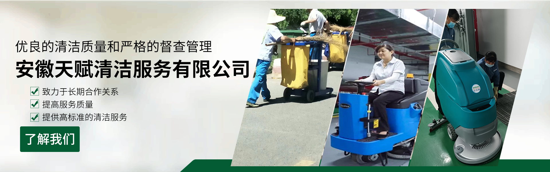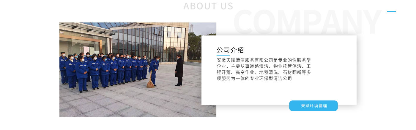 安徽天賦清潔服務有限公司是的服務型企業,主要從事道路清潔、物業托管保潔、工程開荒、高空作業、地毯清洗、石材翻新等多項服務為一體的環保型清潔公司。公司管理機制完善,清潔作業經驗豐富,擁有技術力量,嚴格實行崗前培訓—崗中督查—上崗在培訓的員工管理措施,憑著優良的清潔質量和嚴格的督查管理,為眾多企事業單位、醫院、酒店、廠區商場、物業、道路、學校、公園等提供后勤清潔服務。在業內擁有良好的口碑。工作人員,服務態度優,竭力為客戶提供好的保潔服務。安徽天賦清潔服務有限公司:致力于長期合作關系,提高服務質量,提供高標準的清潔服務。公司的經營理念:為營造一個更清潔、亮麗的生活和工作環境而努力!“誠信”是公司成功保證?!翱蛻糁辽?,信譽為首”是公司宗旨。高標準提供服務,維護客戶利益、形象,是我始終不渝的目標。